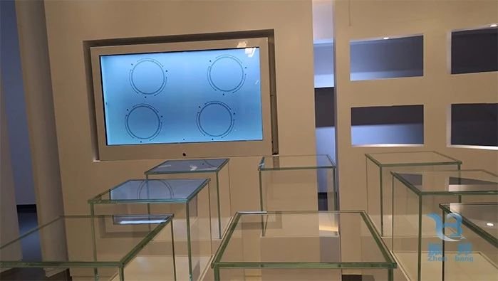 透明展柜結合實物共同展示的互動形式,帶有觸摸功能,通過透明屏上的畫面配合后方的實物,兩者相結合,以圖文及視頻方式展示,極大的豐富了展示內容和效果